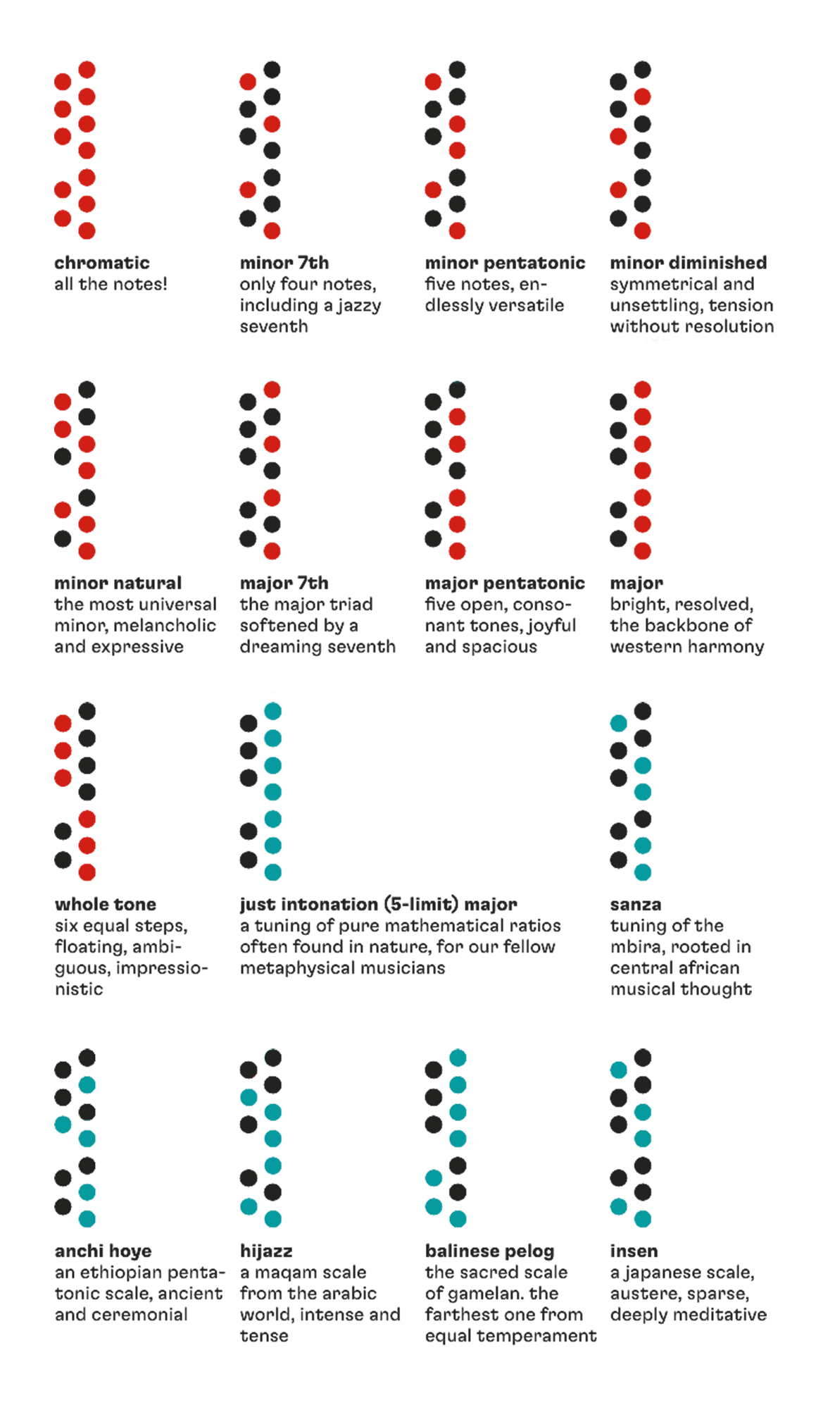 the first 9 scales are in equal temperament and the last 6 scales have their own, microtonal tunings.